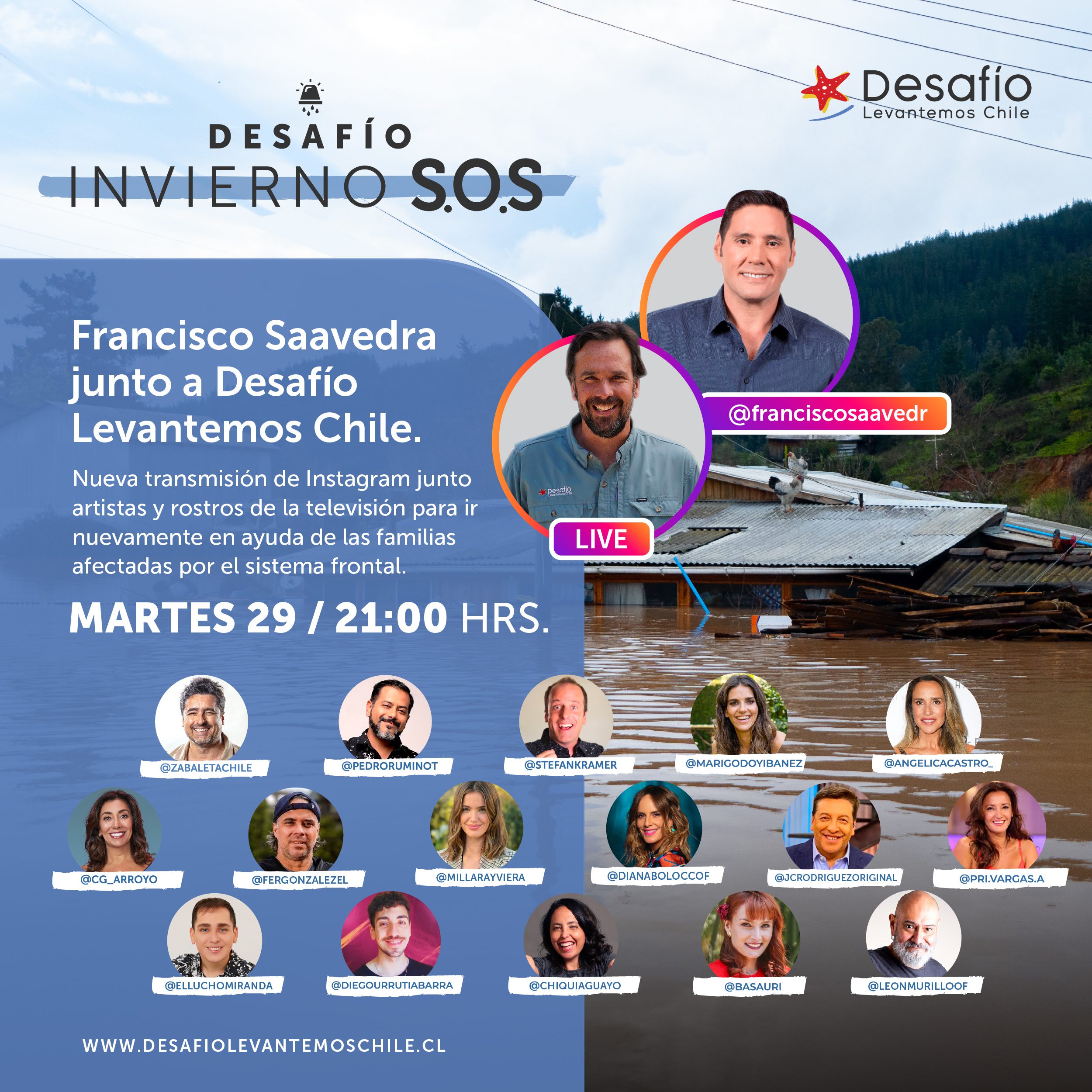 La trasmisión de Instagram, se llevará a cabo el martes 29 a las 21 hrs, a través de la cuenta de Pancho Saavedra (@franckscosaavedra) y Desafío Levantemos Chile (@desafiochile).